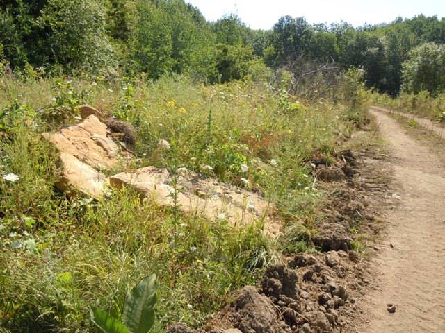Это плиты бывшего руинированного дольмена, из тех, которые расположены ниже основных рядов Богатырской поляны. Он был хорошо заметен слева от дороги, ведущей на восточный участок Богатырки. В этом году, прокладывая свою дорогу, лесорубы спихнули плиты дольмена на обочину. И теперь они оказались справа от дороги. Исследовать памятник теперь уже вряд ли возможно.