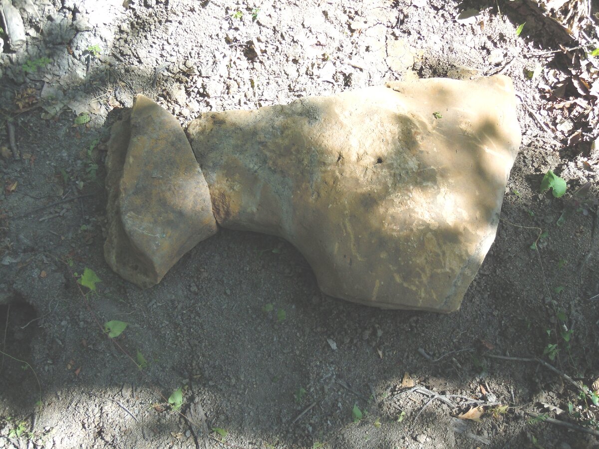 Могу добавить, что других крупных камней жёлтого песчаника не было. Хотя мелкие камни или осколки имелись. Была также пара камней железистого песчаника. Вообще, камень там имеется далеко не везде (и чаще это известняк), т. к. кругом лес на грунте. Также это место выделяется обилием кусков, в т. ч. и крупных, лимонита. Возможно, совпадение. Изделий рук человека не отмечено.