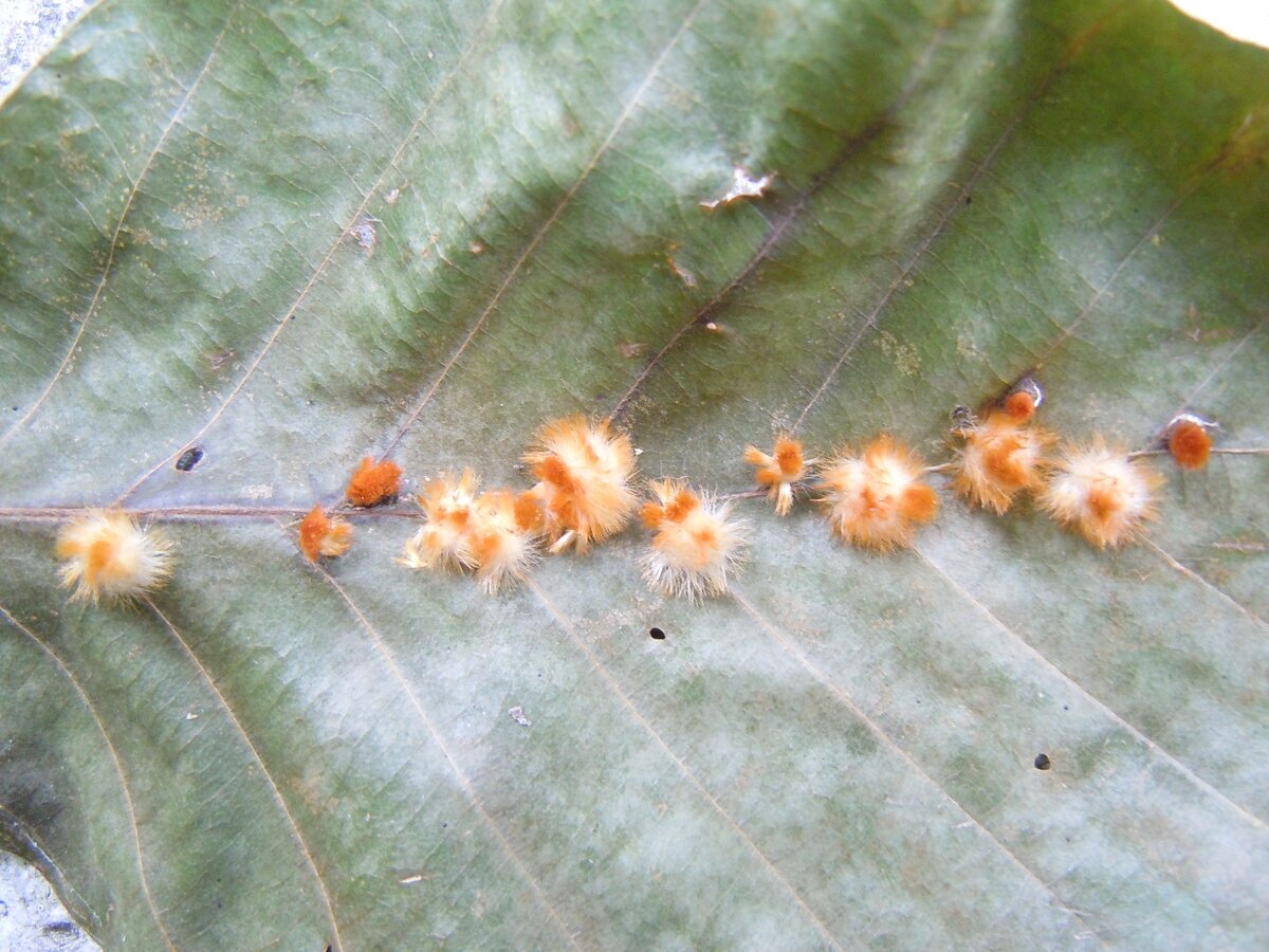 В этом 2023 году на упавшем листе бука заметил вот таких пушистиков.