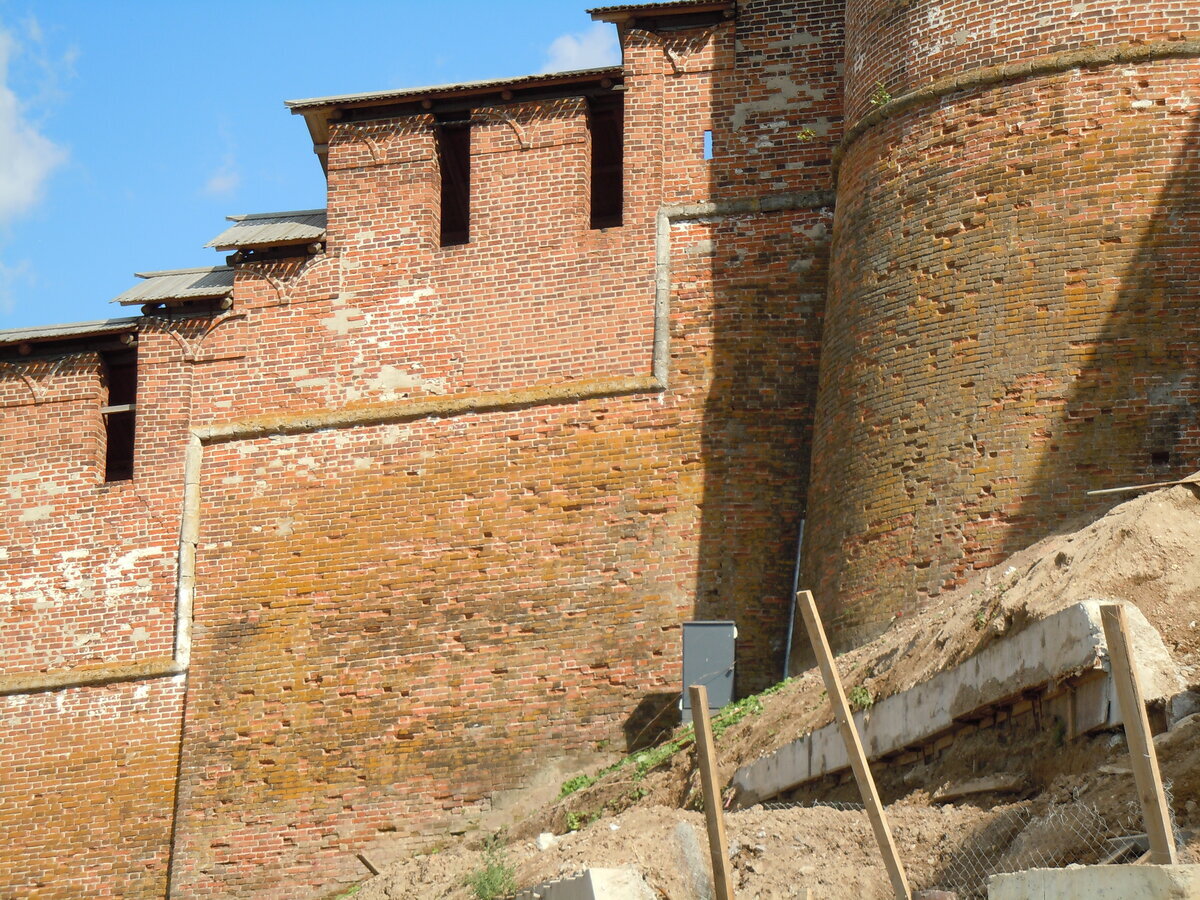 На Георгиевской башне бросилась в глаза такая вставка на полувалике. Уж не пластик ли пробуют применить, как было на Арсенале. Это также напоминает белый блок в стене около Коромысловой башни.