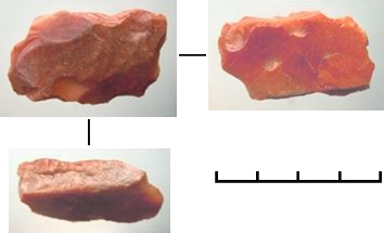 Но сейчас он определяется как кварц, подвергнувшийся воздействию огнём. Об этом свидетельствуют бледно-розовый цвет камня на изломе, полное отсутствие прозрачности, четыре скола от воздействия огня на брюшной поверхности (одна чешуйка так и не отскочила) и некоторая трещиноватость.